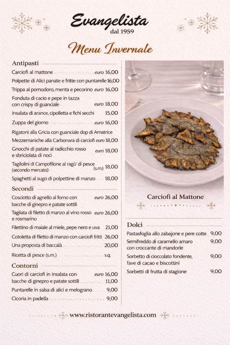 “ Evangelista in via delle Zoccolette è una tappa obbligata per gli amanti dei carciofi e delle ricche tradizioni culinarie della città. Mentre il famoso Carciofo alla Giudia del Ghetto Ebraico è ampiamente celebrato, Evangelista offre un tocco davvero unico con il suo "carciofo al mattone ”