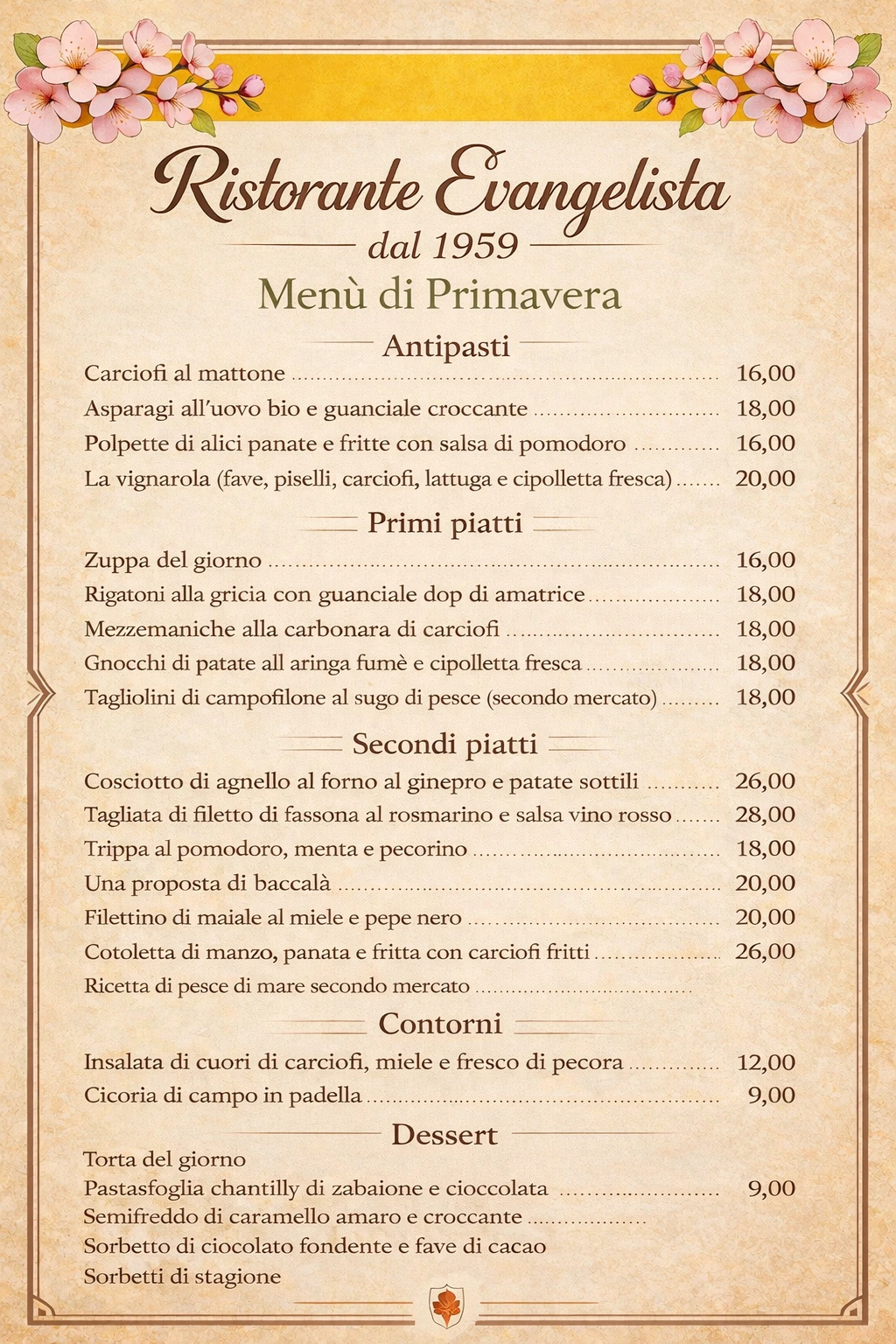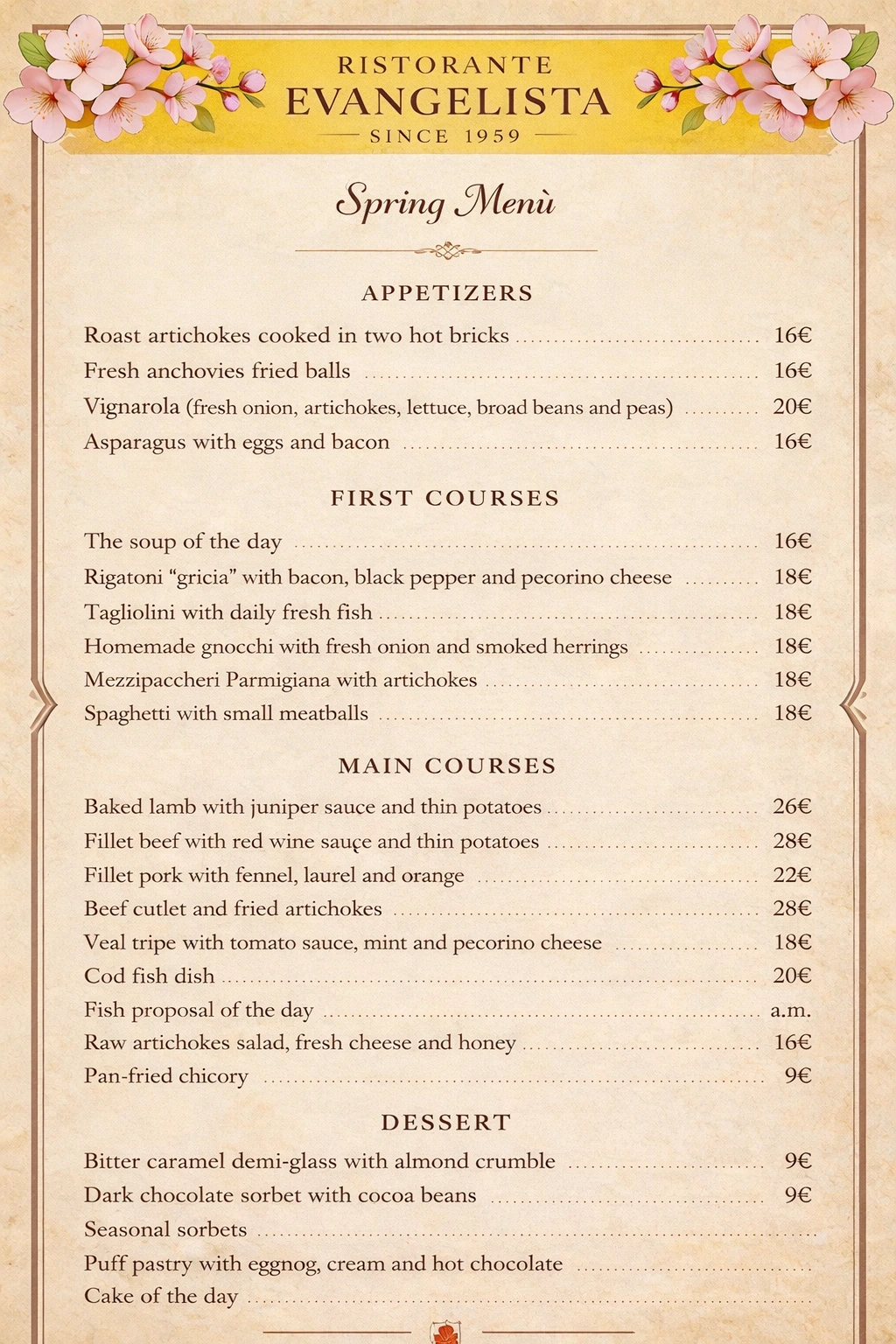 The restaurant has been open since 1959, when Evangelista, born in Amatrice, and his wife Virginia, originally from Abruzzo, decided to open a trattoria in this location.